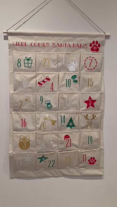 Fabric Reusable Christmas Advent Calendar | 24 Pocket Hanging Countdown | Santa Paws Dog Calendar
